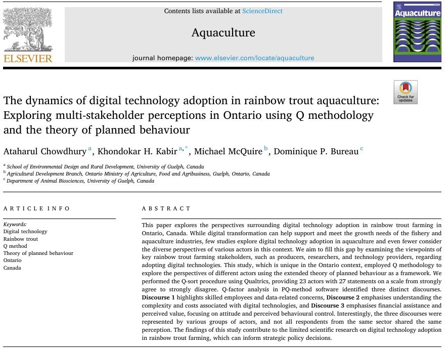 Chowdhury, A., Kabir, K.H., McQuire, M., & Bureau, D.P. (2025). The dynamics of digital technology adoption in rainbow trout aquaculture: Exploring multi-stakeholder perceptions in Ontario using Q methodology and the theory of planned behaviour. Aquaculture, 594, 741460.