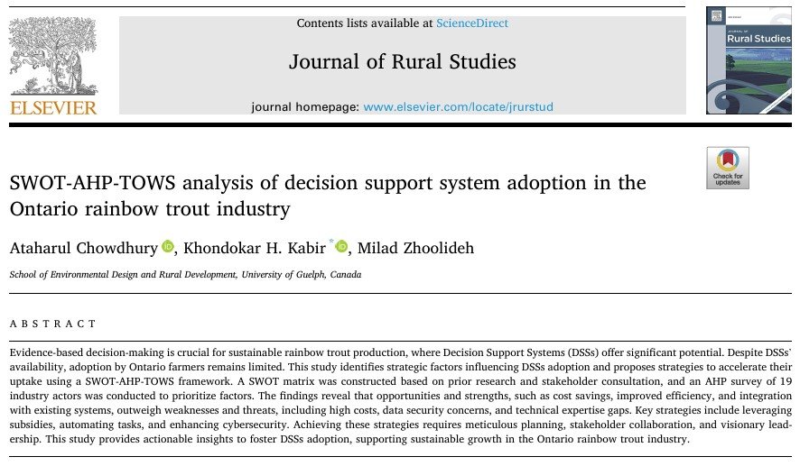Chowdhury, A., Kabir, K.H., & Zhoolideh, M. (2026). SWOT-AHP-TOWS analysis of decision support system adoption in the Ontario rainbow trout industry. Journal of Rural Studies, 123, 104040.