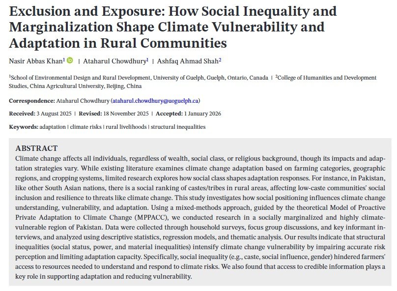 The initiative is part of the Banting post-doctoral fellowship of Dr. Nasir Abbas Khan. This project aims to understand three interrelated contemporary challenges faced by the agri-food sectors and associated communities: climate change, misinformation, and social inequality. Specifically, it explores how climate adaptation among socially disadvantaged communities in the South Asian Caste system is influenced by misinformation—a growing challenge in agri-food sectors—and their social statuses in society, which contribute to their vulnerabilities. South Asian society has operated on a centuries-old social class system that continues to exist across its countries with minor variations. This system categorizes communities or tribes into low or high castes based on the significance of their work. This project aims to understand how climate risks impact communities situated at the lowest rungs of this social class system. Specifically, the project explores the skills and knowledge about climate change, induced risks, and respective adaptation strategies of the newly turned farming communities of a socially disadvantaged low-caste community in Pakistan. The project seeks to understand how social disparities (being low-caste communities) exacerbate vulnerabilities to climate-related challenges and how misinformation compounds these issues. It seeks to understand the unique interplay between knowledge of climate and misinformation risks and adaptation strategies employed by farmers. The initiative draws on mixed-method design and uses state-of-the-art impact assessment models and qualitative approaches.